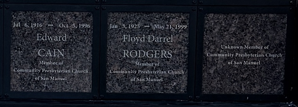 The three columbarium nameplates of the cremains reinterred from Community Presbyterian Church of San Manuel in the Mountain Shadow Presbyterian Church Columbarium/Memorial Garden on 11-23-25. See the individual nameplates.