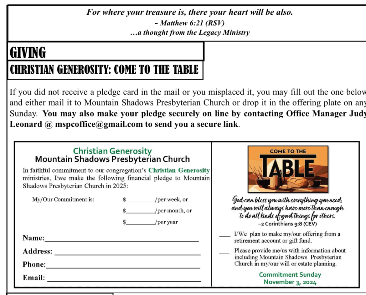 Secure on-line giving is available at any time. Please consider adding 2 % to the total gift to help offset the processing fee. By giving on-line, you also are supporting our Green Living Initiative.